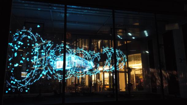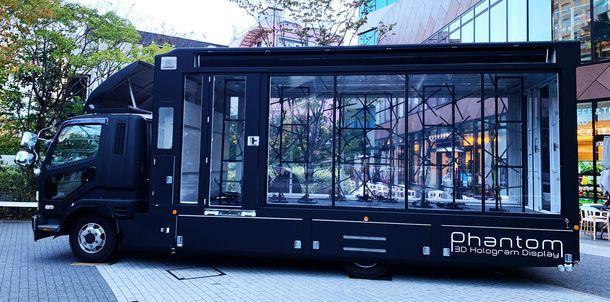 トラック自体がスケルトンのため、ガラス越しに木々や建物などの街並みが普通に見え、それらを背景としながら宙に映像が浮いているかのように見えます。