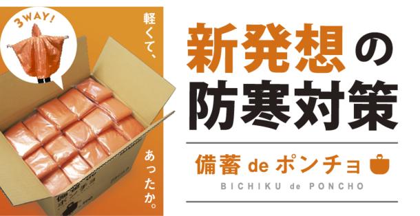 「備蓄deポンチョ」は、低コストかつ省スペースで、防寒対策・トイレの目隠し・レインウェアと3WAYで使える、毛布より手軽で、ブランケットより機能的な新発想の防寒対策アイテムです。