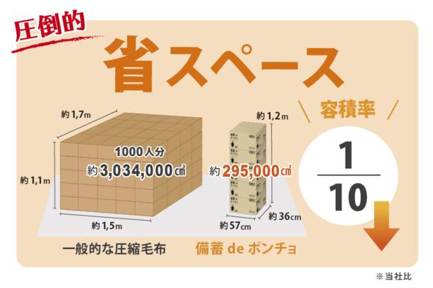 一般的な圧縮毛布を1,000人分備蓄する場合、約3,034,000cm2の容積となりますが、「備蓄deポンチョ」は約295,000cm2で圧縮毛布のなんと10分の1!