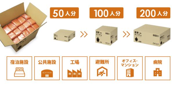 「備蓄deポンチョ」は、50人分/100人分/200人分の3種類のラインアップ。
