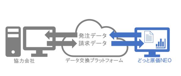 協力会社との発注・請求データを他社製「データ交換プラットフォーム(改正電子帳簿保存法対応)」で共有し、かつ、協力会社からの請求書データを自社で承認することで、原価データとしてどっと原価NEOに定期的に自動取込みされます。これにより手作業による人為的なミス(漏れ・重複・入力間違いなど)と業務時間、経費が大幅に低減され、受発注業務の大幅な効率化が期待できます。
