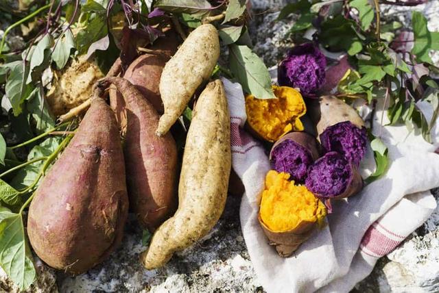 果皮が赤く果肉が濃い紫色「ちゅら恋紅」、皮が白だが果肉が紫色の「備瀬」と夕陽のような肉色の「あかね芋」
