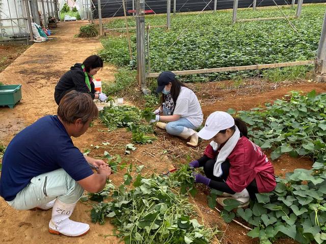 星のや沖縄は、新型コロナウイルスの影響でオープンが5月から7月に延期となりました。休業の期間を利用して、地域に貢献し地域の魅力を学びたいというスタッフの発案のもと読谷村へ相談。当時、サツマイモ基腐病が流行し窮地にある農家を支援するため、イモ苗の刈り取りと配布の作業にボランティアとして参加しました。各農家で植え付けられ苗は、10月頃から収穫を迎えましたが、コロナ禍の影響で行き場を失っています。