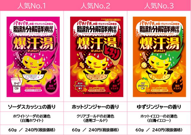 「ハッピークリエイション!(幸せ創造)」をもとに、当社商品に関わる全ての人が、ワクワク楽しく、幸せになることを目指す株式会社バイソン(本社:大阪市城東区、代表取締役社長:宮崎賢二)の人気入浴剤、「爆汗湯」シリーズ(各240円 ※税抜価格)をご紹介します。