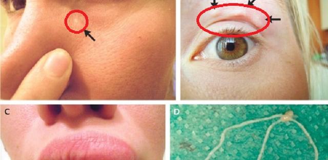 Na região das pálpebras é possível ver que o volume está alterado. Após cinco dias, o verme se movimentou e alcançou o olho esquerdo. No 10º dia, o parasita havia se deslocado para seu lábio superior. Desesperada, ela correu para que o médico fizesse a extração do bicho.