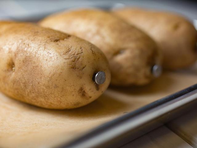 The jury is out, but some people swear by it: Inserting a clean, new aluminum nail through your potato might help it bake faster. The idea here is that the heat-conducting nail will cook your potato from the inside, while the oven bakes the outside.