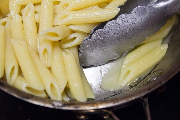 Most pasta aficionados will tell you that the best way to do it is by finishing cooking the nearly-done pasta on the heat in its sauce with a little of the pasta-cooking water. According to that line of thinking, the starchy pasta water helps to bind and thicken the sauce, and in some cases—such as buttery or oily sauces—emulsifies it into a creamy, non-greasy coating. All of my own pasta-cooking experience supports that theory, but I'd never done side-by-side tests to prove that it actually works better.