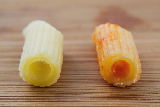 Both the pieces of penne you see came from the same batch of pasta, which I started cooking at exactly the same time in the same pot of salted boiling water. About halfway through the pasta's suggested 12-minute cooking time, I fished out half the penne and immediately transferred it to a pan with some simmering tomato sauce, and cooked them together, gradually adding ladlefuls of the pasta-cooking water, much like making risotto. Here's what happened:
