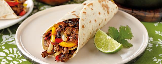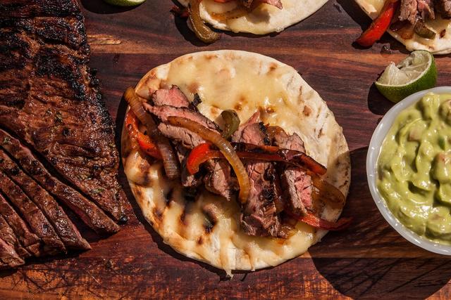 While fajitas are more commonly made with skirt steak, flank steak makes a fantastic filling as well. It may seem out of place in a Mexican (or Meximerican) recipe, but soy sauce is actually quite a common fajita marinade ingredient. I mix mine with oregano, ground ancho chile (or if I'm lazy, chili powder), cumin, garlic, and sugar, oil, and lime juice. You can go all out and serve it restaurant-style with grilled peppers and onions, but that's just gilding the lily—well-cooked meat doesn't need much more than a squeeze of lime, some chopped onions and cilantro, and s bit of fresh salsa.