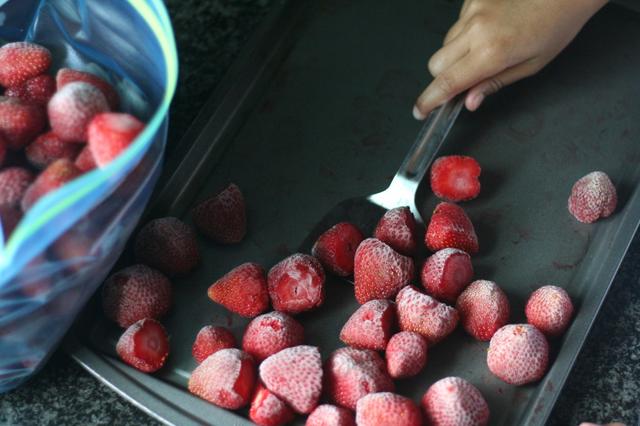 Step 4: Lay berries on cooking sheet in single layer and freeze for one hour. (this is called flash freezing)
