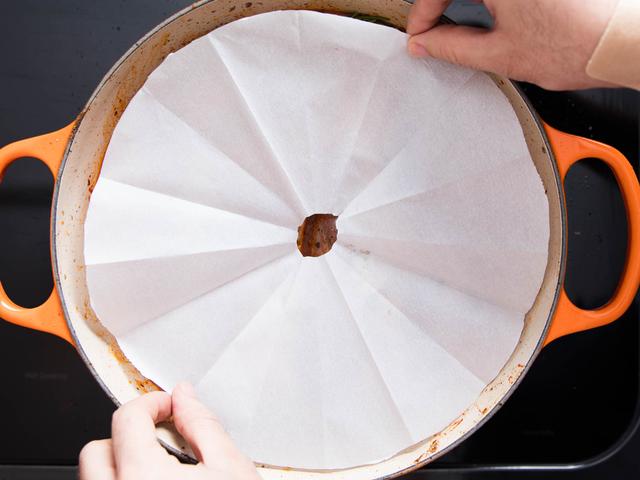 A parchment paper lid, on the other hand, takes a minute or two to prepare. But once ready, it does an admirable job of providing a semipermeable cover for all the food in the pot. It's also incredibly easy to make. Here's how: