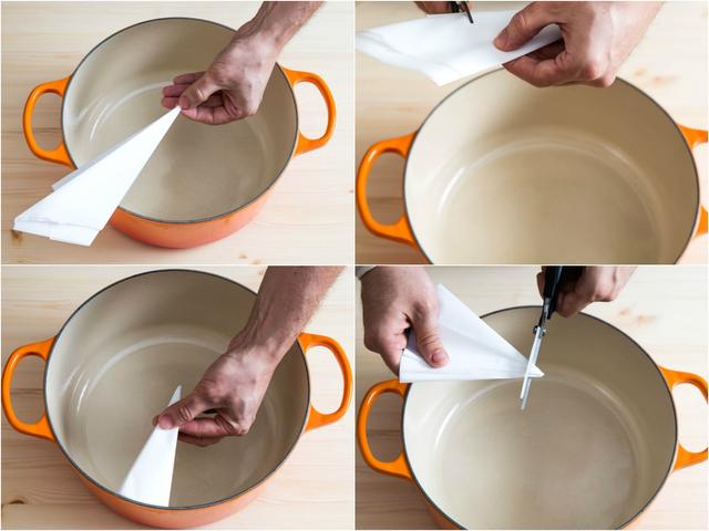 Start by cutting a square piece of parchment paper that's just slightly larger than the pot itself.
