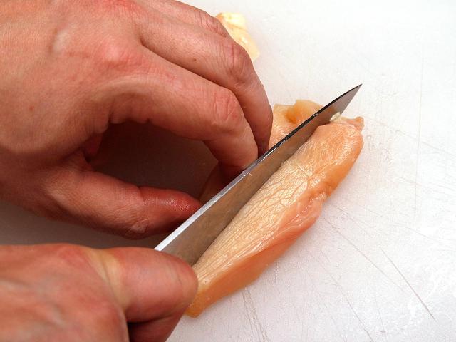 For slices, hold the chicken breast with your non-knife hand, curling your fingertips under your knuckles (so you don't slice them off!), and slice the chicken with long, even strokes into slices about 1/4-inch thick.