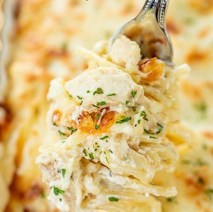 - Spread chicken evenly on top of pasta mixture. Top with Alfredo sauce.