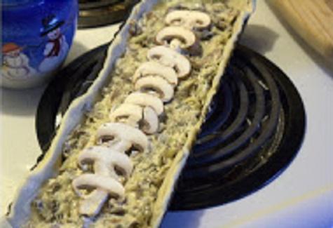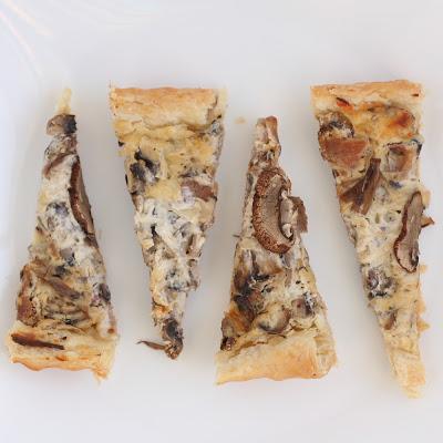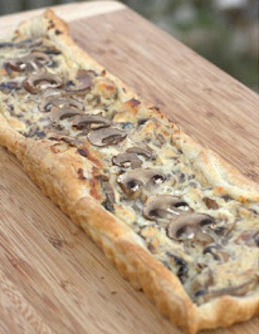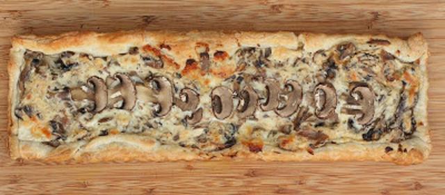 Using the reserved sliced mushrooms, decorate as desired.Bake for 20 minutes or until the puff pastry is golden brown and the tart filling is also browning.