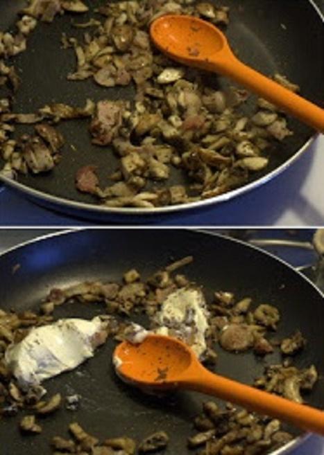 To make the filling, cook the chopped bacon, onion, garlic, chopped mushrooms and herbes de Provence over medium heat until the bacon is cooked and the mushrooms have released most of their liquids.