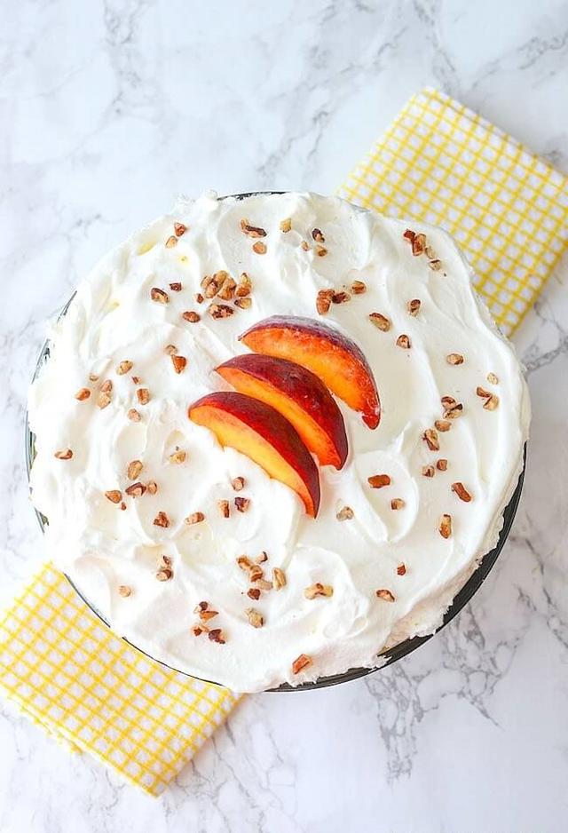 - Top the peaches with half the tub of whipped topping.