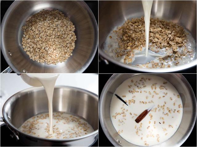 1. In a 3-quart stainless steel saucier, toast rolled oats over medium-low heat until the grains are fragrant and lightly browned, about 8 minutes, shaking and swirling the pan continuously to prevent scorching. Off heat, add milk and cream, along with vanilla bean and cinnamon stick (if using). Cover and steep up to 4 hours at room temperature, then set aside vanilla bean and cinnamon stick to reserve for step 3.
