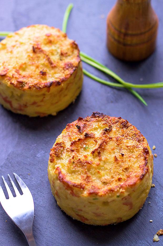 Healthier than pan fried potato patties, these baked mashed potato cakes are cooked in oven for a result that is crisp in the outside and melting in the inside. This easy side dish is ideal to accompany holiday dishes like grilled meat, fish and poultry. Freezable in Ziplok bags and easily portable, they are also perfect to use up those Thanksgiving leftovers!