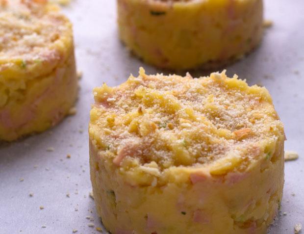 4. On the baking sheet, using a ring mold, sprinkle a layer of breadcrumbs, then scoop potato mixture to shape the cakes—about 1 1/2 inch thick. Press down slightly with the back of a spatula and finish with another thin layer of breadcrumbs. Remove the ring mold and repeat the process.