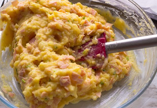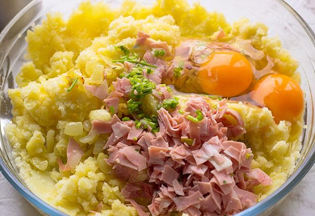 2. In a large bowl, combine potatoes, eggs, pancetta, onions, butter and chives. Season with salt and pepper to taste. Adjust the texture with a bit of milk if necessary.
