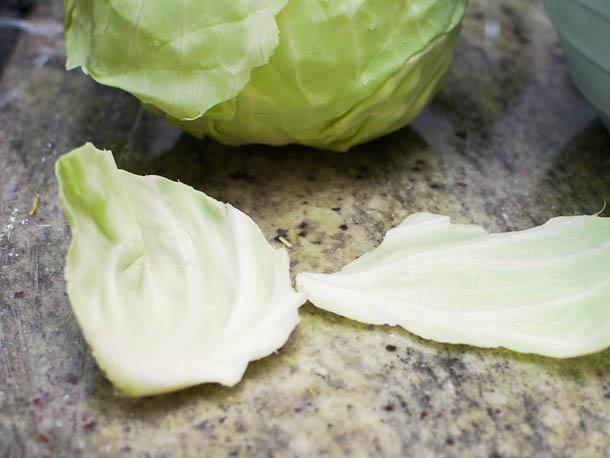 The first step when making this dish is to tear the cabbage leaves by hand. It may seem a bit tedious compared to the efficiency of a knife, but the gracefully curved, uneven edges are a key characteristic of the dish, and give it a softer overall texture than sharply angled pieces would.