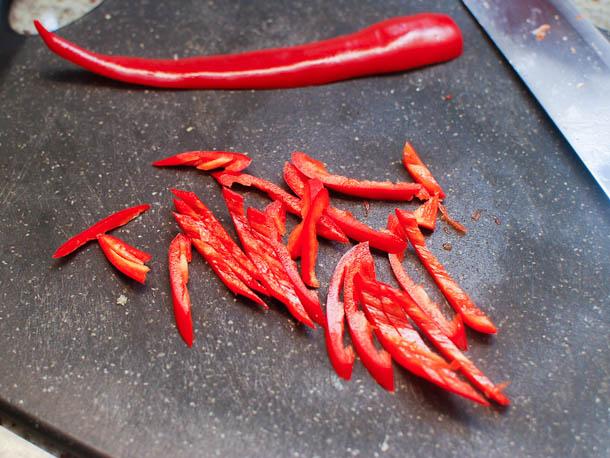 Next, you'll want to prepare the aromatics for the flavor base, in this case garlic, scallions, and red chilies. Fresh chilies are more common in Hunan cooking, and therefore are what I use here. I also like to stay true to Hunan's spicy flavor profile, and include the chilies' seeds to make sure I don't lose any of the heat they pack (for those sensitive to spicy foods, discarding the seeds is an option, though the dish will lose some of its impact).