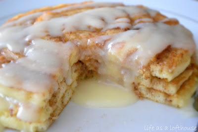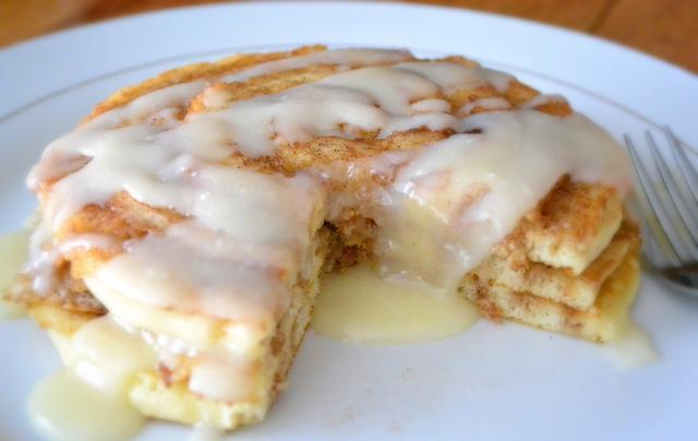 When ready to serve, spoon warmed cream cheese glaze on top of each pancake. Enjoy!