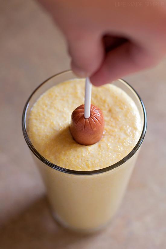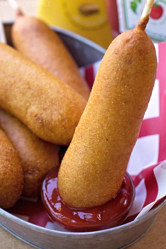 I let my corn dog sink to the bottom and then turned it with tongs to ensure that wit was browning evenly on all sides. Cook for about 2-3 minutes (you want to make sure they're fully cooked inside), then transfer to a paper towel lined plate. Repeat with remaining hot dogs (you may have to tilt the glass a bit to get the last few ones fully dipped).
