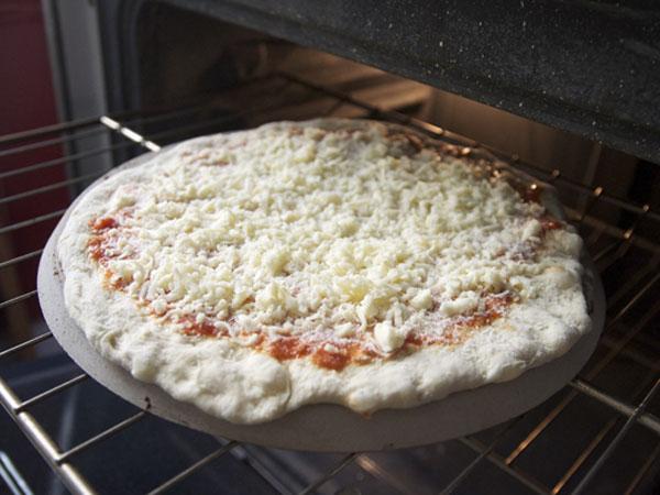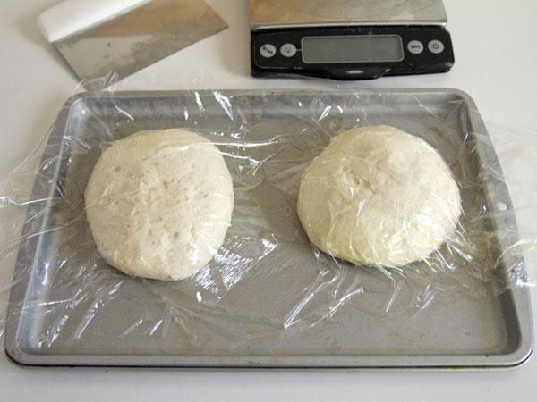 4. To bake the pizza: One hour before baking pizza, adjust oven rack to second highest position (rack should be about 4 to 5 inches below broiler), set pizza stone on rack, and heat oven to 500 degrees. Remove dough from refrigerator and divide in half. Shape each half into smooth, tight ball. Place on lightly oiled baking sheet, spacing them at least 3 inches apart; cover loosely with plastic wrap coated with nonstick cooking spray; let stand for 1 hour.
