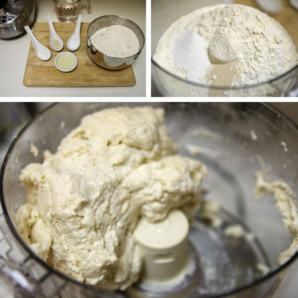1. For the dough: In food processor fitted with metal blade, process flour, sugar, and yeast until combined, about 2 seconds. With machine running, slowly add water through feed tube; process until dough is just combined and no dry flour remains, about 10 seconds. Let dough stand 10 minutes.