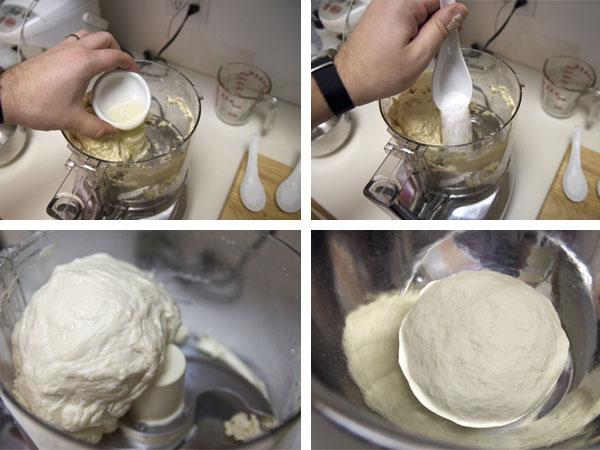 2. Add oil and salt to dough and process until dough forms satiny, sticky ball that clears sides of workbowl, 30 to 60 seconds. Remove dough from bowl and knead briefly on lightly oiled countertop until smooth, about 1 minute. Shape dough into tight ball and place in large, lightly oiled bowl. Cover tightly with plastic wrap and refrigerate for at least 24 hours and up to 3 days.