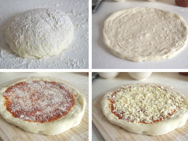 5. Coat 1 ball of dough generously with flour and place on well-floured countertop. Using fingertips, gently flatten into 8-inch disk, leaving 1 inch of outer edge slightly thicker than center. Using hands, gently stretch disk into 12-inch round, working along edges and giving disk quarter turns as you stretch. Transfer dough to well-floured peel and stretch into 13-inch round. Using back of spoon or ladle, spread 1/2 cup tomato sauce in thin layer over surface of dough, leaving 1/4-inch border around edge. Sprinkle 1/4 cup Parmesan evenly over sauce, followed by 1 cup mozzarella.