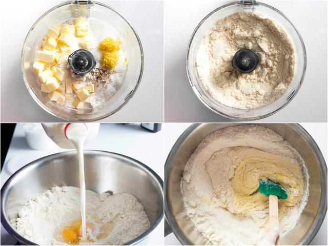 1. Adjust oven rack to middle position and preheat to 350°F (180°C). Line a 10-inch cast iron skillet with parchment paper and set aside. Combine flour, sugar, baking powder, lemon zest, salt, baking soda, coriander, nutmeg, and butter in the bowl of a stand mixer fitted with a paddle attachment. Mix at low speed to form a mealy powder, about 2 minutes. If you like, this "mix" can be held overnight at cool room temperature in an airtight container. To proceed, transfer to a large owl and stir in the milk, eggs, and vanilla (if using).