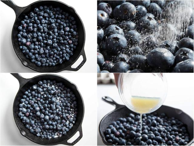 2. Transfer blueberries to the parchment-lined skillet and shake gently to distribute in an even layer. Sprinkle with sugar, lemon juice, and salt. Dollop batter over the surface as evenly as possible, then smooth with an offset spatula. Bake until muffin is puffed and golden brown, about 45 minutes. The exact bake-time will vary depending on the skillet's gauge, so keep a close eye on it to prevent overbaking.