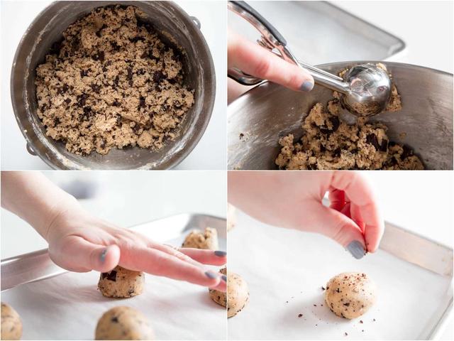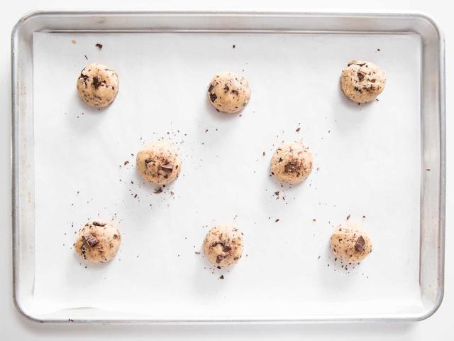 5. Portion the Dough: With a 2-tablespoon cookie scoop, divide the dough into about 32 pieces, firmly compressing each portion into the scoop with the palm of your hand or the edge of the bowl. Arrange on a parchment-lined aluminum baking sheet, leaving 2 inches between each. With the palm of your hand, gently press each portion to minimize its dome. This step is not meant to smash or flatten the cookie dough, but to create a slightly level surface. Sprinkle each with chopped chocolate and a pinch of salt.