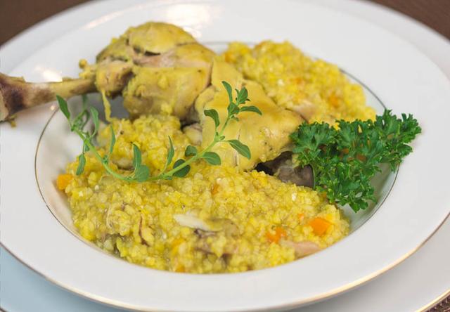 • Deixe a quirera de molho de véspera em água fria. Coloque a quirera para cozinhar com 1 litro de água e 1 cubo de caldo de galinha.