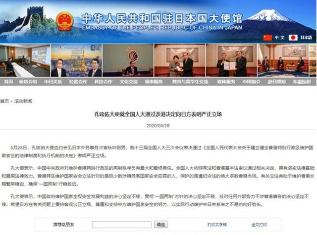 「中国政府の国家の主権・安全・発展上の利益を守る決意は確固不動のものであり、『一国二制度』の方針を貫徹する決意は確固不動のものであり、いかなる外部勢力による香港地区の事への干渉にも反対する決意は確固不動のものだ。日本側がこの問題において客観的で公正な立場を堅持し、国家の安全を維持する中国側の努力を尊重し支持し、ようやく得られた中日関係の好転基調を実際の行動によって維持することを望む」とした。(編集NA)