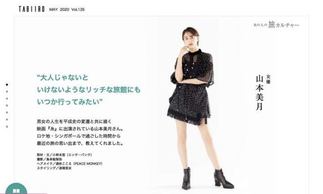 【女優の山本美月さんが登場する電子雑誌「旅色」(ブランジスタ)の2020年5月号がこのほど、公開された。山本さんは、透け感のある黒いドット柄のブラウスに、超ミニ丈の黒いツイードのスカート、ハードめな印象の黒いショートブーツを合わせた大人の甘辛ブラックコーデで、すらりとした美脚を見せている。