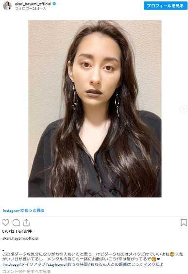 ダーク風メイクをインスタで披露したところ、「かんわいいー似合う」「クールビューティ」「めちゃくちゃダーク びっくり!」「ダークなメイクかっこいいね」と、ネット上にコメントが寄せられていました。