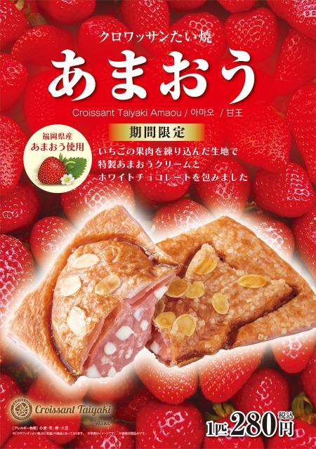 「クロワッサンたい焼 あまおう」は、生地にいちごの果肉を混ぜ込んだオリジナルの生地が特長となっています。クロワッサンたい焼の特長である”サクッ”とした食感に、福岡県産あまおういちごを使用したクリームとホワイトチョコを混ぜ合わせ、心地よい甘酸っぱさとほどよいあまさを生かした仕上がりにしました。