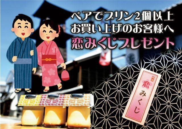 ペアでプリンを2個以上購入のお客に、限定100組で、“地元の由緒ある神社”にて“縁結び御祈祷済み”の『恋みくじ』をプレゼントします。