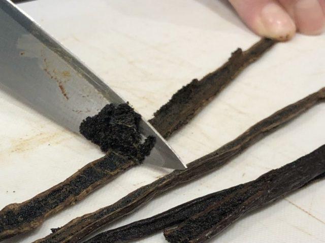 莢から丁寧に取り出されるバニラビーンズ