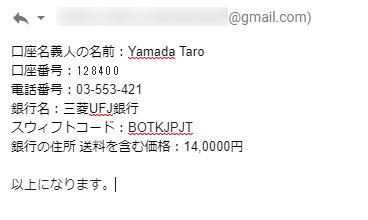 で、ここは実在しない銀行名、口座、名義を教えてみた。名前はYamada Taroとか適当書く。