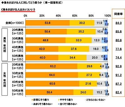 魚をさばける人に対してカッコいいと思うか聞いたところ、「非常にそう思う」「ややそう思う」と答えた人が84.0% という結果となった。性年代別では、20代女性が92.8%、30代女性では91.2% と、若い女性の大多数が魚をさばける人を魅力的と感じることが分かった。