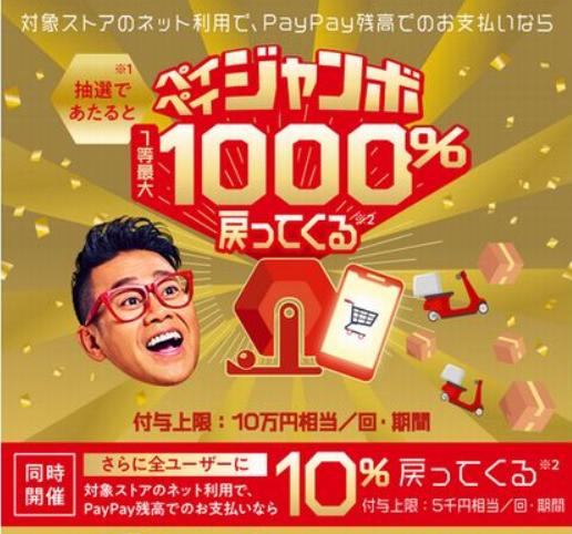 6月1日午前0時~6月30日午後11時59分に、最大1,000%還元の「ペイペイジャンボ(オンライン)」と基本10%還元の「6月はオンラインがお得!最大10%戻ってくるキャンペーン」の2つを行う。