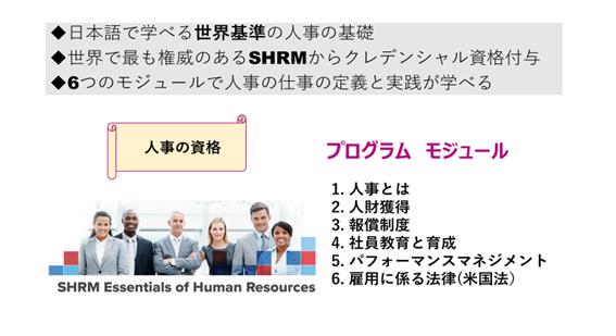 シャーム【SHRM-Society for Human Resource Management】がその70年を超える歴史で、英語以外の言語で資格研修、資格付与を行うのは初の試みであり、日本語で日本にいながらシャーム【SHRM】の講義を受講し、クレデンシャル資格が取得できることは人事教育の革新ともいえることです。