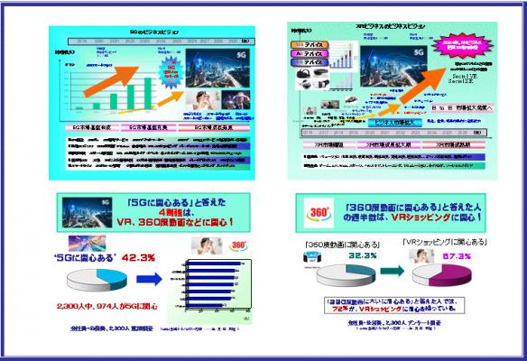 5G関連製品サービスの中でとくに注目されるXR(VR/AR/MR)ビジネスの市場性について調査したところ、XRデバイスはエンターテイメントなどの民生用途だけでなく、ソリューション、設計開発、トレーニングなどの産業用途が市場拡大傾向にあり、世界的に50~70%の高成長を続け、5年後の2024年のグローバル市場は18兆円規模が予測される。2020年には東京五輪の開催も市場促進要因のひとつであるが、その他注目されるところでは、アップルまたはスタートアップ等の本格的ARデバイス(スマートグラス)の発売も予想される。現実空間と重ね合わせるコンテンツのクラウドサービス等の新潮流が予想されている。ビジネスマンへの意識調査では、日本の持ち味はアニメなどのコンテンツであり、バーチャルYouTuberなどの可能性が挙げられている。VR関連では360度動画、自由視点なども注目されている。