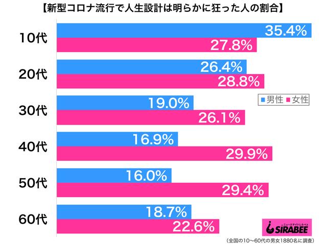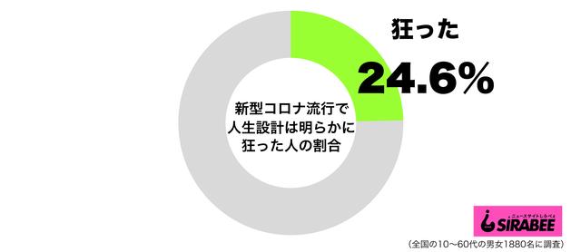 しらべぇ編集部では全国10〜60代の男女1,880名を対象に調査したところ、全体の24.6%が「新型コロナウイルス流行で、自分の人生設計は明らかに狂った」と回答した。