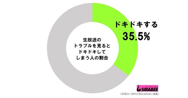 ちなみに、しらべぇ編集部が、全国10代~60代の男女1,653名を対象に調査を実施したところ、全体の35.5%が「生放送のトラブルを見るとドキドキしてしまう」と回答した。